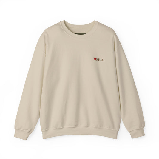 Crewneck Sweatshirt — Minimal "Be Real" Heart Chest Logo